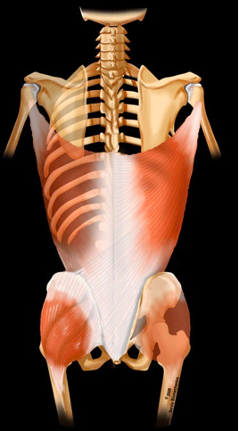 途中也會與第8-12根肋骨相接,也同時連接到下胸椎及腰椎,過程中也會些許的覆蓋到肩胛骨
